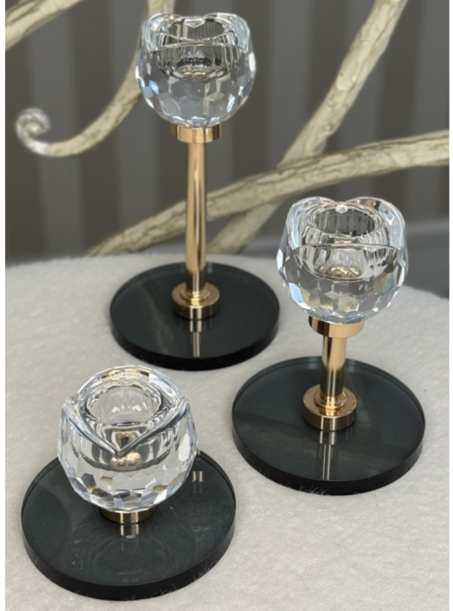Вишуканий набір з трьох свічників різних розмірів стане стильним акцентом у вашому інтер’єрі. Прозорі кришталеві чаші гармонійно поєднуються з металевими ніжками та масивною чорною підставкою, створюючи елегантний та сучасний вигляд.